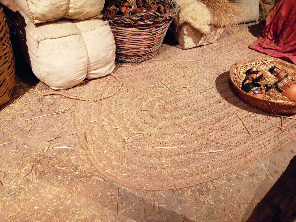 estoraf. ‘Peça de teixit de llata de palma, d’espart, de jonc o d’altra matèria semblant, destinada principalment a cobrir paviments, parets, baranes de carro’.